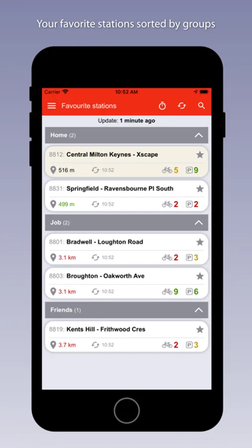 - List of favorite stations categorized by groups (home, work, friends or general).
