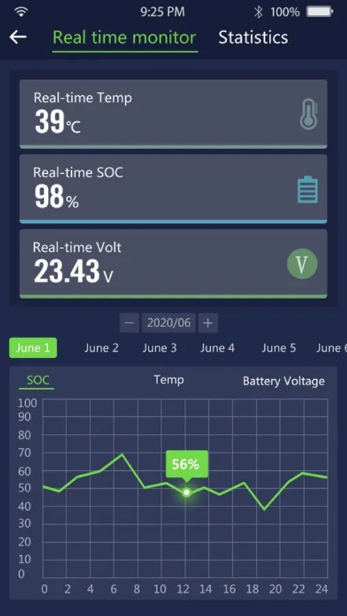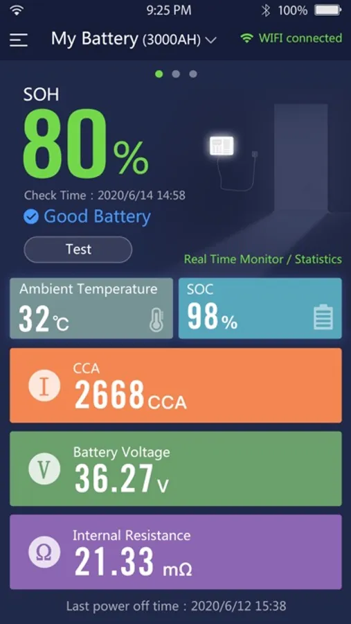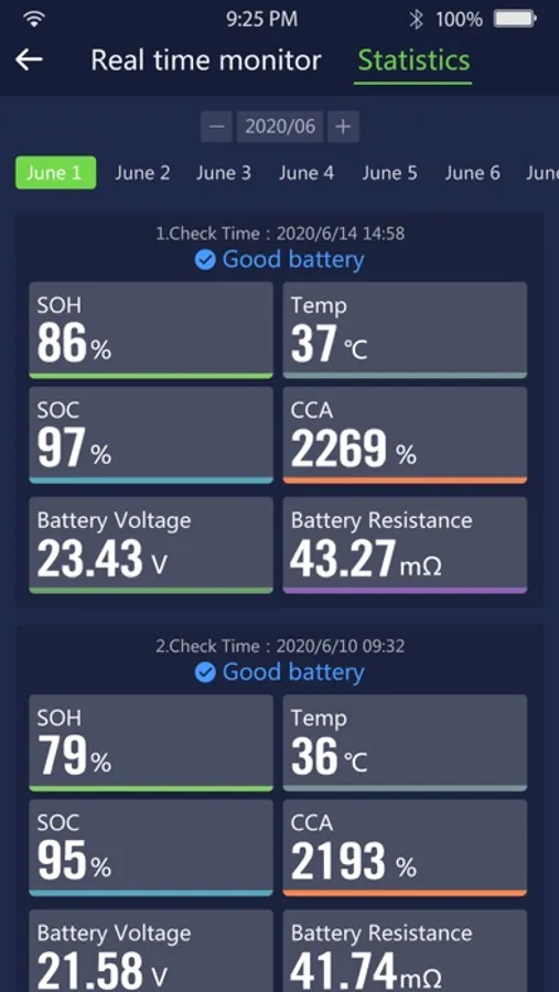 Battery temperature, volt, charge can be reviewed in real-time. In the statistic table, user can check battery SOH, temperature, SOC, CCA, Internal resistance, Ah, volt which is tested by app automatically or manually.