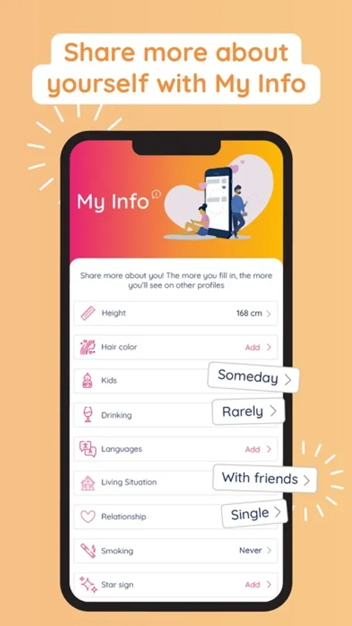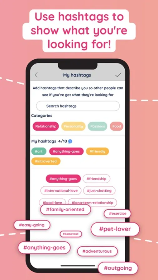 • Add unique hashtags to your profile to show potential matches what you’re interested in