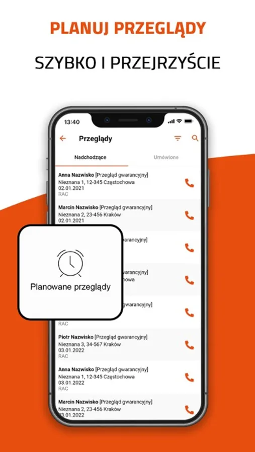 Aplikacja Gree wyświetli Ci listę zaplanowanych przeglądów gwarancyjnych dla zainstalowanych urządzeń: zyskasz wygodny planer, łatwo umówisz każdy przegląd i dodasz jego datę do kalendarza. Będziesz mógł wyświetlić listę przeglądów, filtrując je po nazwie klienta czy miejscu realizacji.