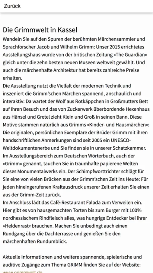 Wandeln Sie auf den Spuren der berühmten Märchensammler und Sprachforscher Jacob und Wilhelm Grimm: Unser 2015 errichtetes Ausstellungshaus wurde von der britischen Zeitung »The Guardian« gleich unter die zehn besten neuen Museen weltweit gewählt. Und auch die märchenhafte Architektur hat bereits zahlreiche Preise erhalten.