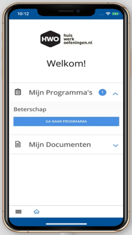 Met de HWO-app kunt u uw oefenprogramma altijd en overal raadplegen op uw telefoon. Zodra u deze app op uw telefoon hebt geïnstalleerd, hoeft u alleen maar in te loggen in de app met de toegangscode die u van uw zorgaanbieder hebt ontvangen.