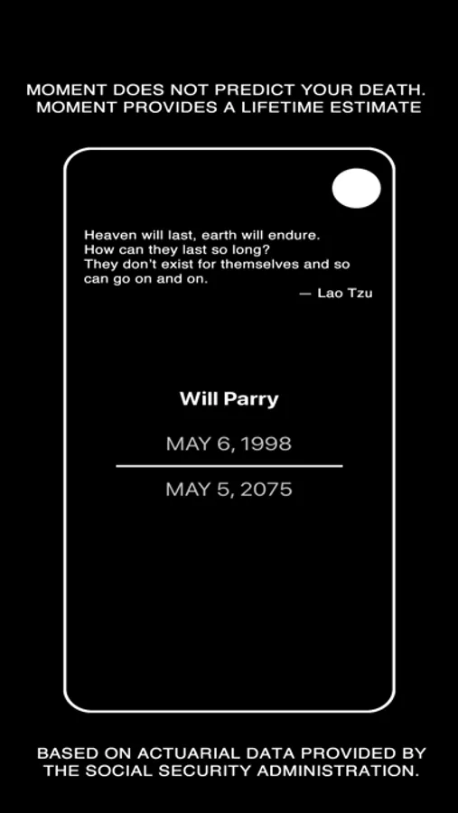 - Moment is not a death clock. Nobody can predict when anyone will die. Moment shows a lifetime estimate based on actuarial data.
