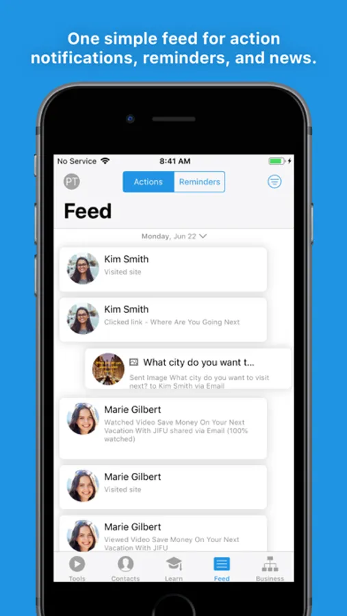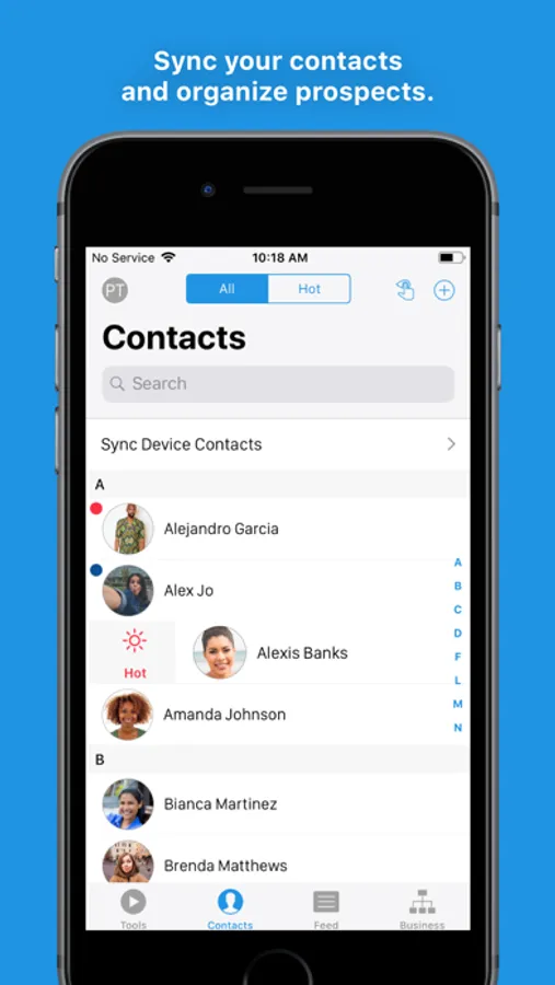 Contacts: Choose how to sync and manage your contacts. Swipe to sort them by interest level. You can make connections, add notes, or check out the Contact Feed to see the tools you've shared and contact actions.