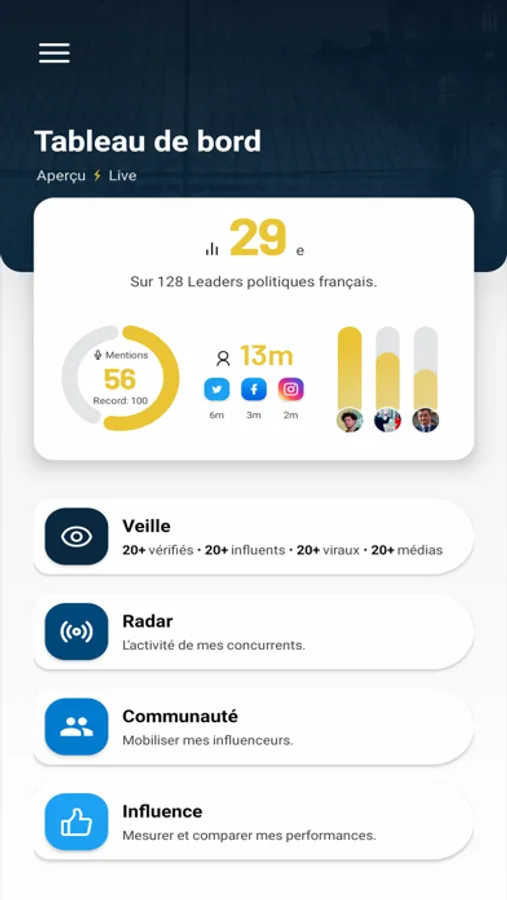 Notitia, c'est une application mobile 100% personnalisable à destination des décideurs qui souhaitent booster leur influence sur les réseaux sociaux, grâce aux fonctionnalités suivantes :