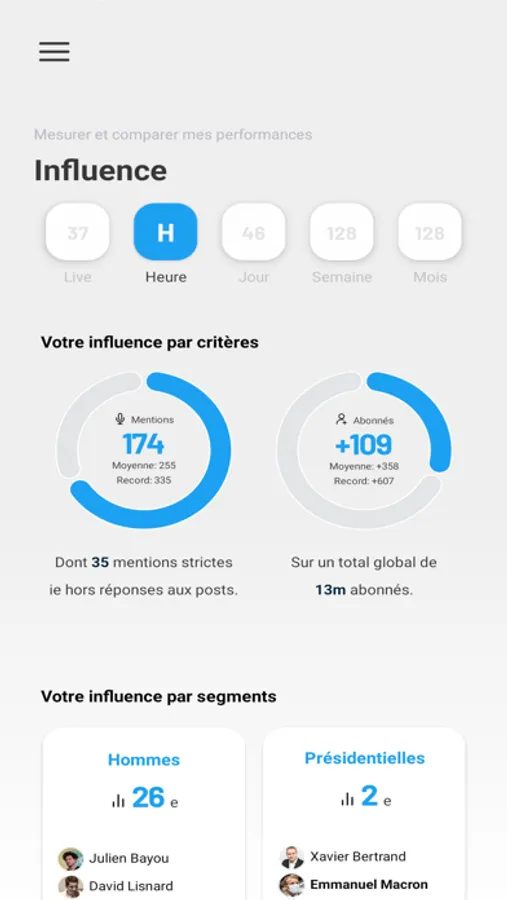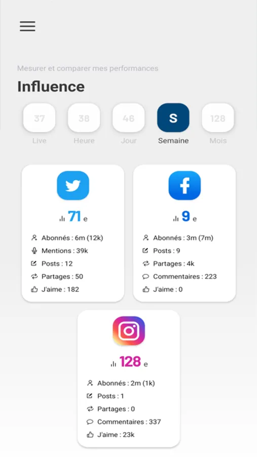 · La mesure de l'influence en temps réel : visualisez et comparez votre activité réseaux sociaux en live, grâce aux rapports détaillés. Mesurez-vous à vos concurrents sur différents réseaux sociaux et différentes périodes : dernières minutes, heure, jour, semaine, mois, ...