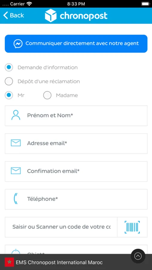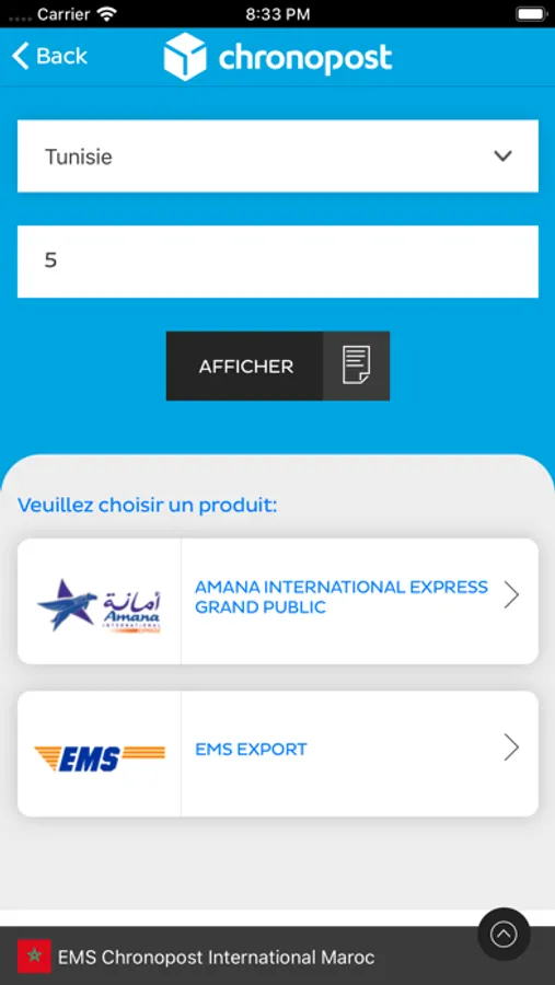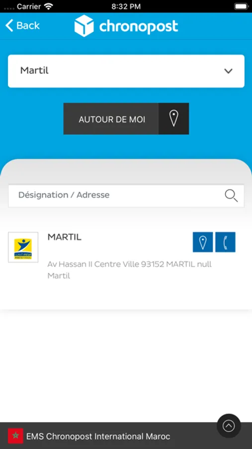 Application mobile exposant aux clients de Chronopost Maroc des services dynamiques et des services d’information. Les services dynamiques sont: