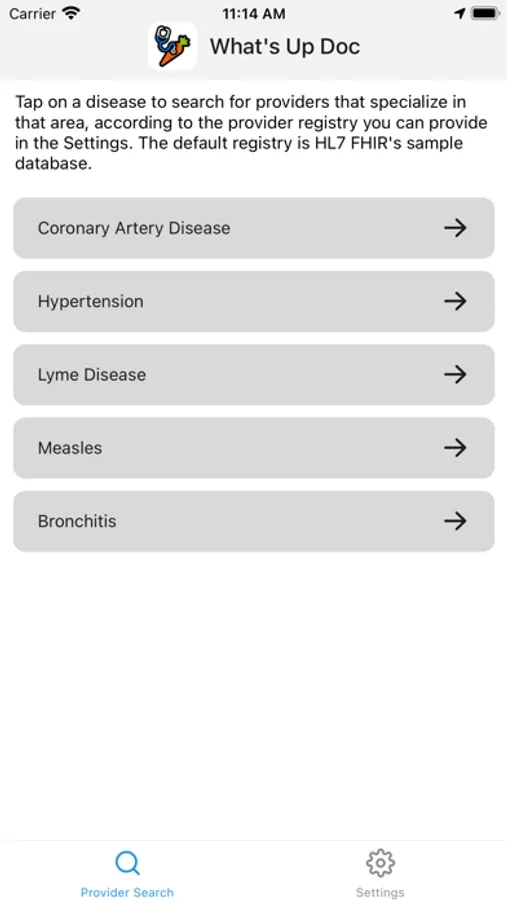 With HL7 FHIR standards on the rise, this app takes advantage of the standardization, and lets you find a provider based on a disease you input! This app comes with HL7's FHIR provider registry, and you can use your own endpoint as well.