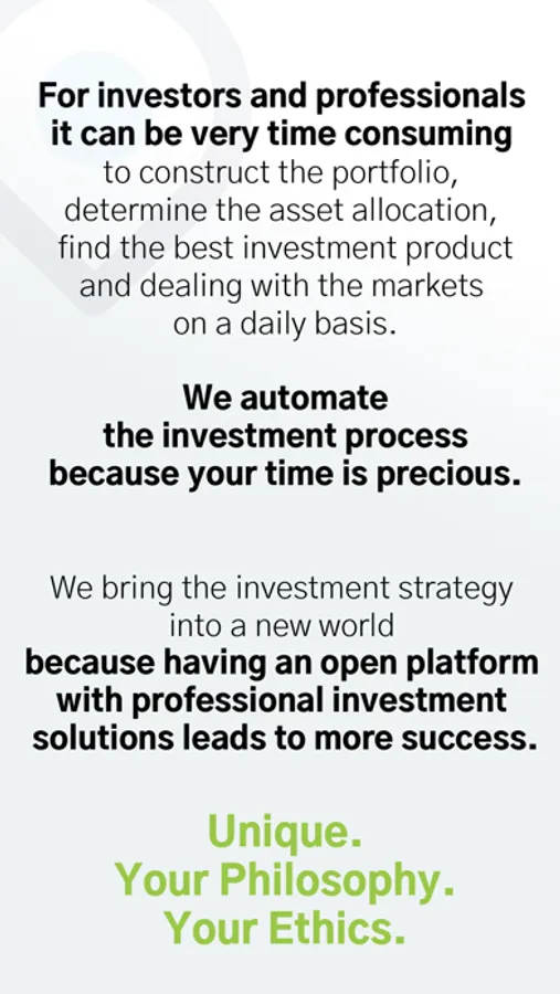 Thanks to our technology, we can asset management easy for you. The unique open platform with model portfolios from well-known providers lets you build your desired investment solution modularly, taking your preferences and investment focus into account.