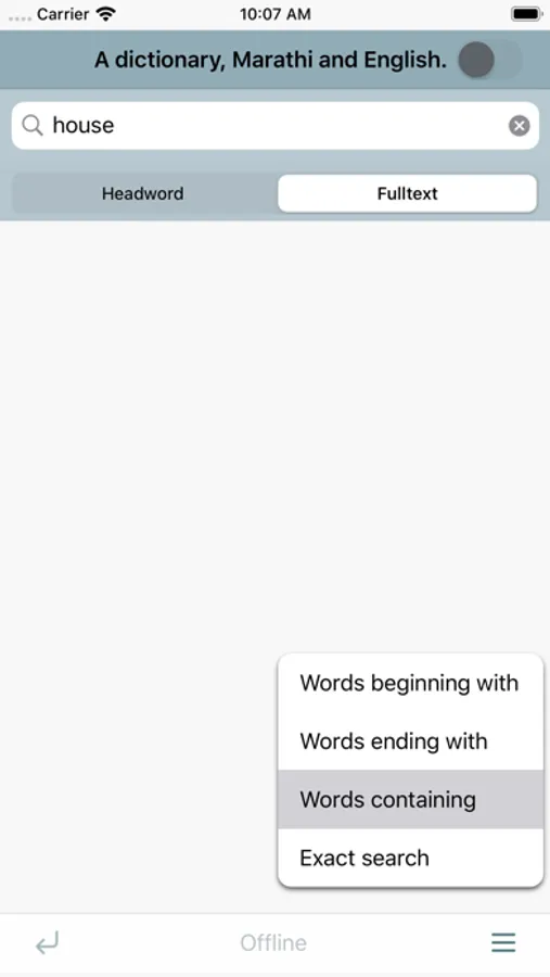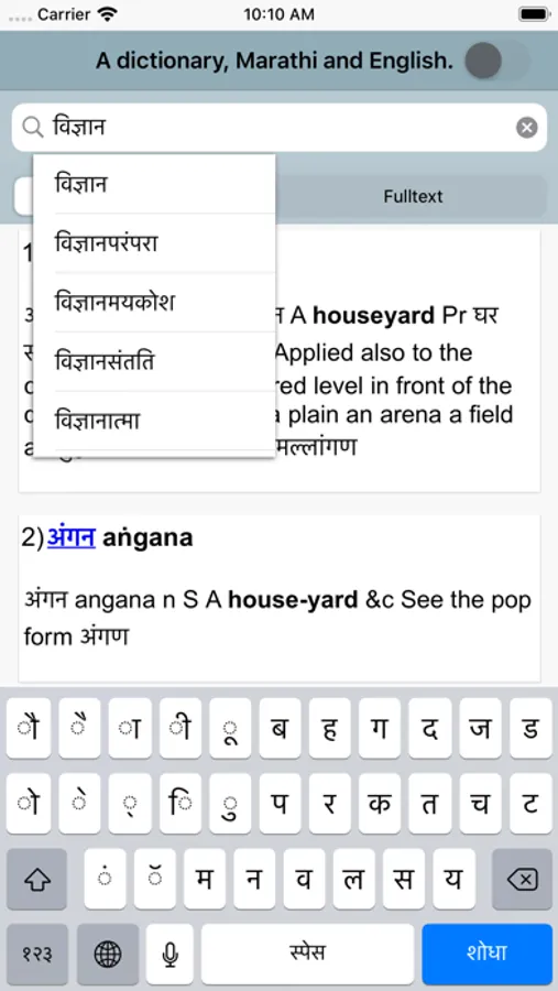 The default mode for this app is to search headwords. To search for a headword, touch the search box at the top (magnifying glass icon) to expose the on-screen keyboard and begin searching. Headwords can be entered in Devanagari, accented latin characters, and unaccented latin characters.