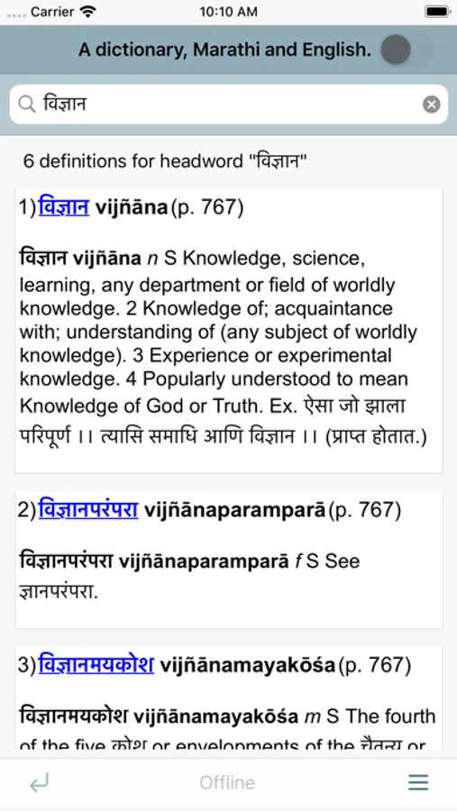 Search results come first in a numbered list that displays the Devanagari headword, the accented latin transliteration of the headword, and a chunk of the definition. To see a full definition, touch the headword.