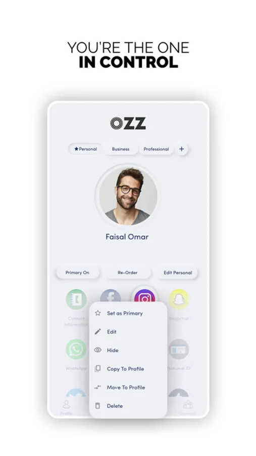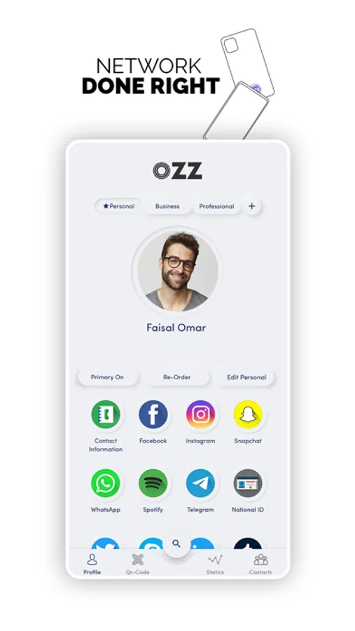 OZZ can combine all your social media, personal/business contacts and your digital IDs all in one. You can digitally or physically share your contact details and social media profiles with others with a simple tap. You can even add contacts or scan nearby contacts using the OZZ app.