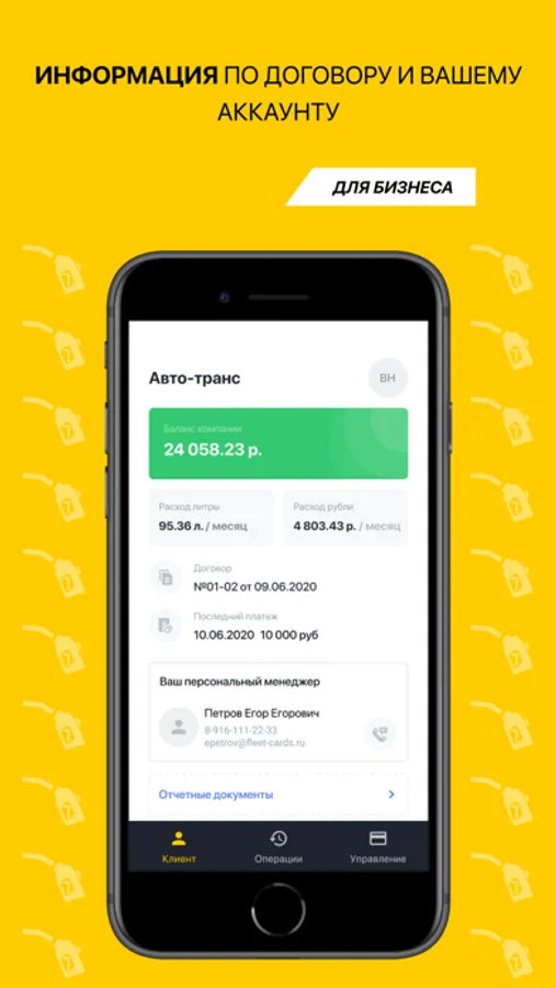 Наименование компании, договор, персональный менеджер, баланс, количество и виды топливных карт