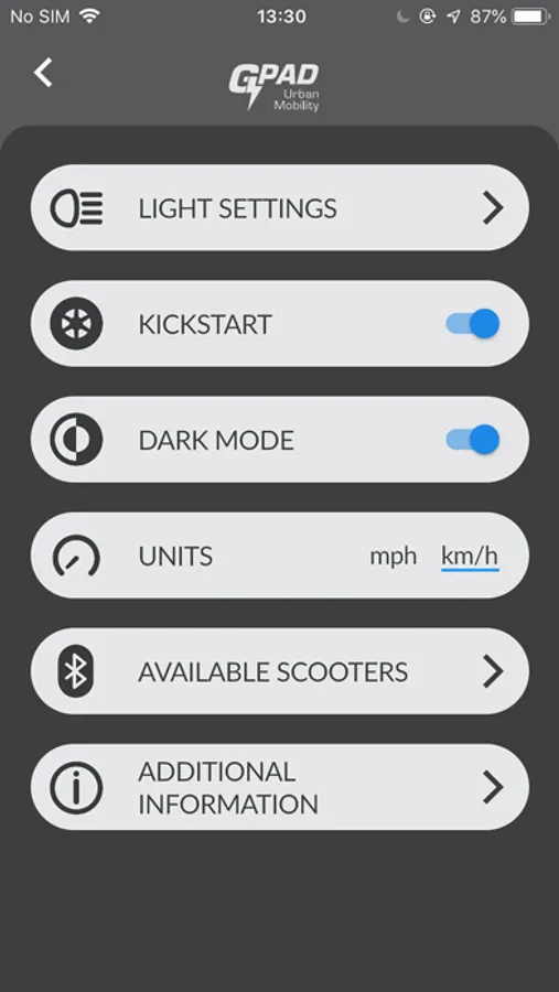 Fiddling with confusing LCD displays on scooters is a thing of the past. Our GPad Svan and GPad Svan Max can be configured with this intuitive and straightforward app. Just connect your scooter via Bluetooth and you gain access to: