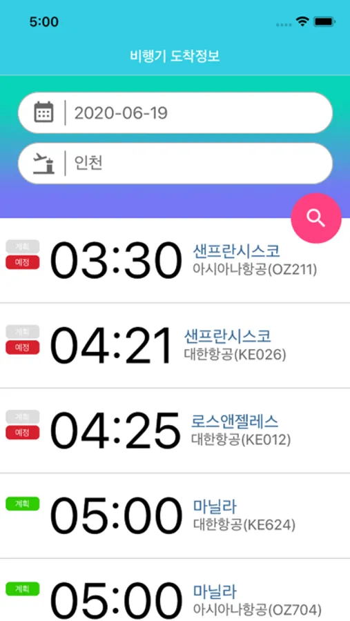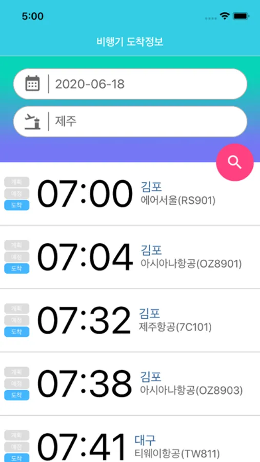 국내 공항의 비행기 도착정보 앱입니다.