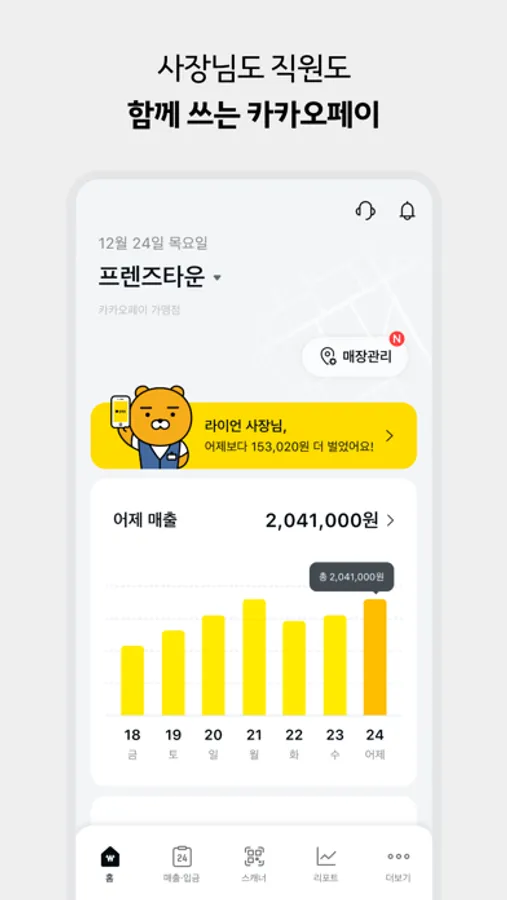 - 카카오페이, 카드, 현금, 배달앱까지! 어제 매출, 오늘 입금예정, 미입금액을 매일 앱으로 볼 수 있어요.