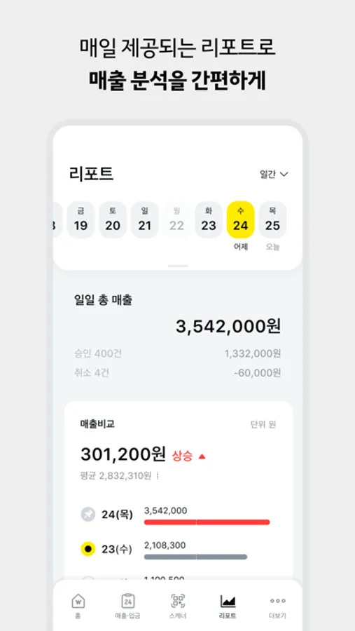 - 얼마나 더 벌었는지, 언제 가장 많이 벌었는지 리포트로 매출 비교할 수 있어요.