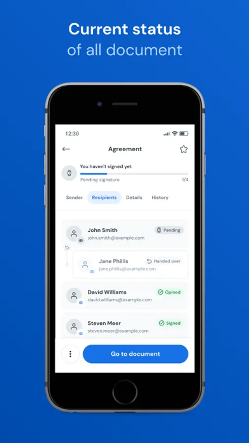 Documents sent through Autenti are immediately available for signature to the indicated recipients. You can collect their signatures at the same time. The addressee receives a secure link to their email address, which redirects them to the document on the Autenti platform. You no longer have to wait for a courier or visit the post office to find a lost package.