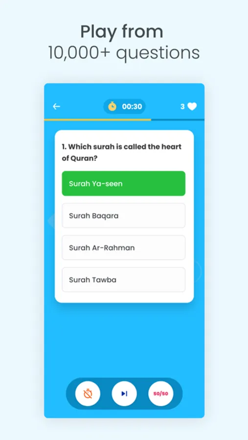 - Power-ups: Use power-ups to skip the question, pause time or reduce the choices to half when needed