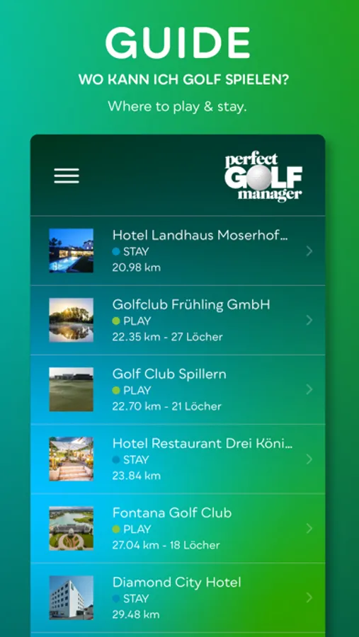 A guide tool provides you with all the necessary data and information about all 35,000 golf clubs worldwide and their partner hotels, editorial content, stories from our Perfect Eagle Golf magazine, golf tips, equipment news, and exclusive benefits.