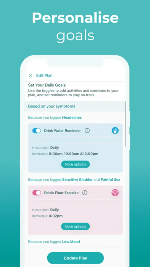 - Symptom toolkit includes: interactive CBT exercises, sleep meditation, muscle relaxation, pelvic floor training, deep breathing, and more.