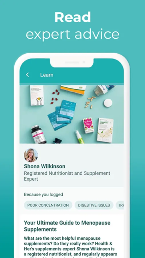 With the Health & Her Menopause App you also gain free access to a library of expert content tailored to the changes you’re experiencing. Complete daily symptom assessments to monitor what is triggering or improving your symptoms. Learn more about your body, mind, and hormones, and discover top tips. From gynaecologists and psychologists, to sleep experts and career coaches - our panel includes some of the UK’s top menopause experts.