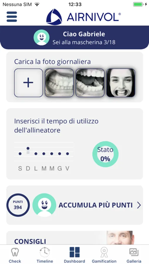 With My AirNivol App you can follow every step of your AirNivol treatment. After setting the required data, the App automatically generates the calendar for your treatment, and sends you reminders for changing aligners and notifications about the correct use of the aligners. You can monitor the daily use of the aligners and take photos of your smile at each change of aligner.