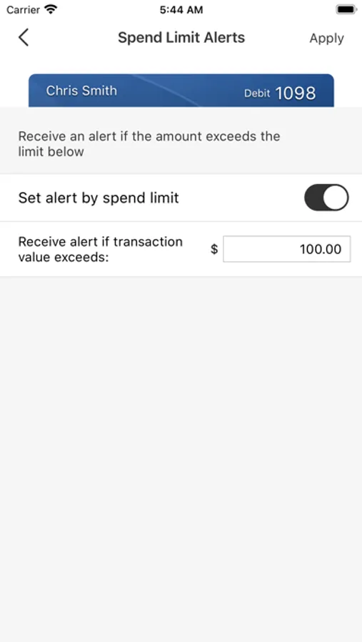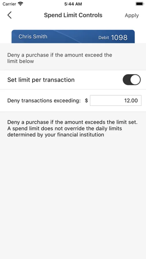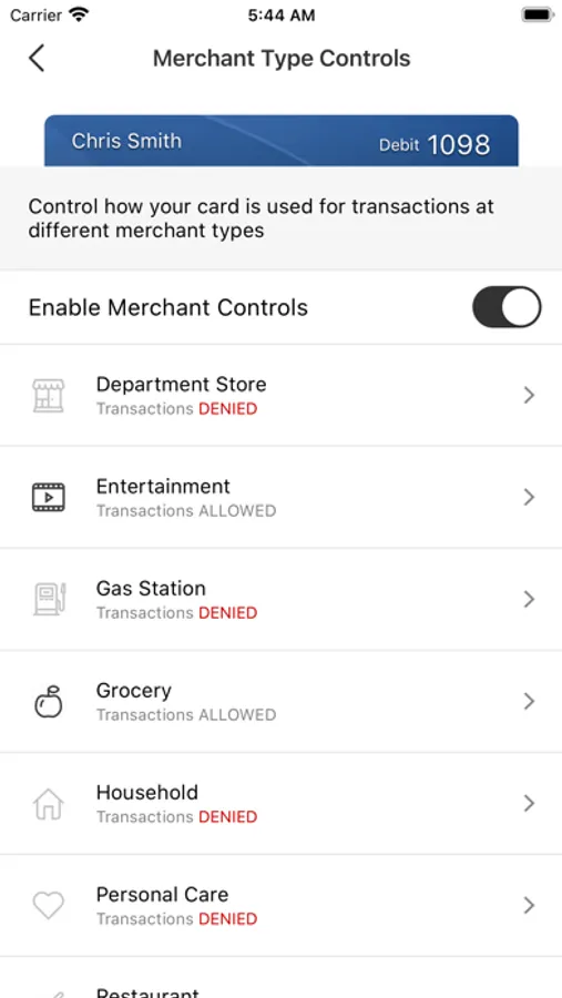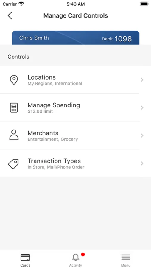 Set spending limits to decline transactions above your thresholds. Monitor activity by category such as gas stations and restaurants, and by type: in-store purchases, e-commerce transactions and ATM transactions.