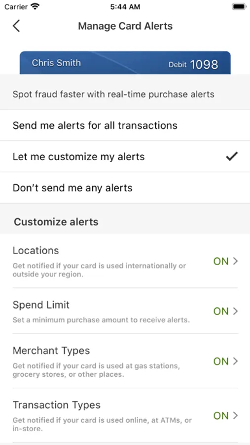 Real-time alerts for PIN and signature transactions keep you informed of your card usage to quickly detect unauthorized or fraudulent activity.