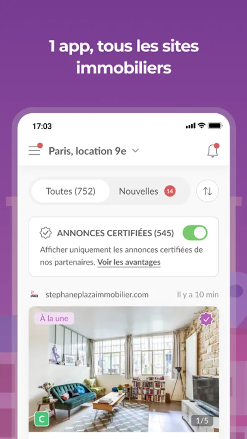 Soyez le premier alerté sur des annonces qui correspondent à vos critères. Recevez en temps réel des push de biens de qualité et soyez prévenu des baisses de prix.