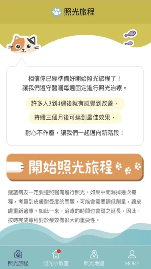 【照光旅程】在這個功能中,我們會協助您記錄下來您每次照光療程的重要資訊,並輔助提醒您進行每週的照光療程。