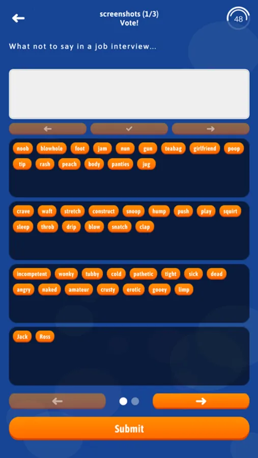 In SemAntics you play with others in creating a sentence around a given question using a given selection of random words. You then vote on who's is the best, they get a point and play goes on for however many rounds you choose.