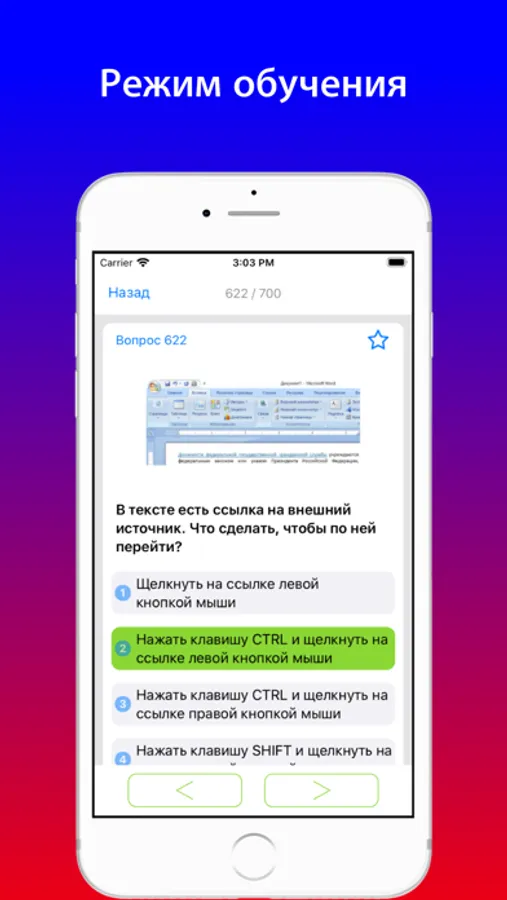• Подготовка - Позволяет изучить вопросы в текстовом формате с отмеченными правильными ответами;