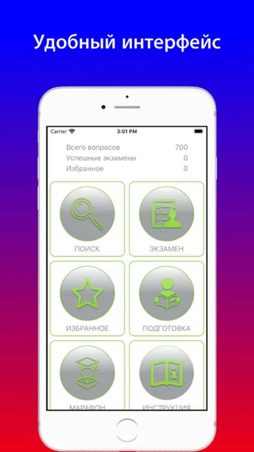 • Режим "Экзамен" - режим максимально приближенный к реальному экзамену. Дается 40 случайных вопросов, 40 минут на решение. Положительная оценка выставляется при правильном ответе на 70% тестовых заданий, в ином случае выставляется оценка - неудовлетворительно;