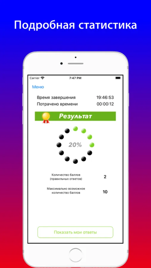 • Работа над ошибками - в режимах "Экзамен", "Марафон" и "Тренировка в избранном" Вы можете сделать работу над ошибками.