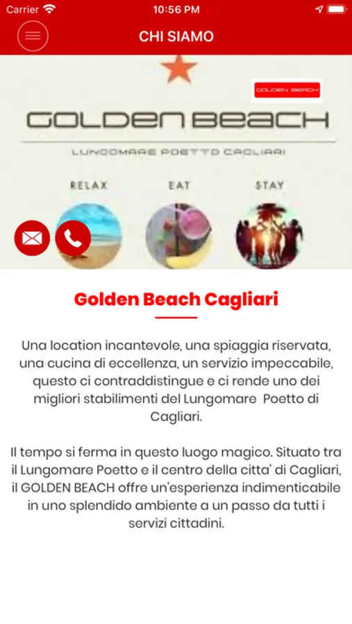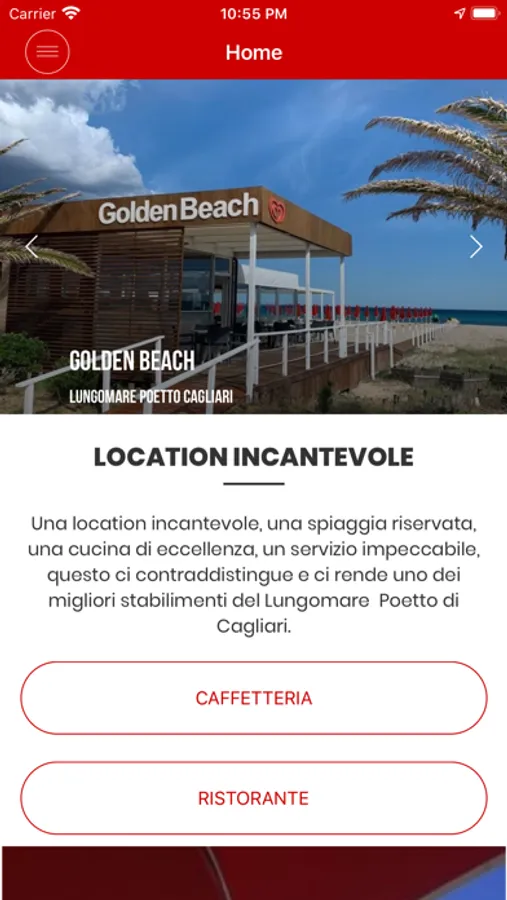 Golden Beach a Cagliari è lieto di presentarvi la sua nuova applicazione mobile, creata per rendere ancora più Smart l'esperienza con il nostro stabilimento balneare. Finalmente potrai prenotare il tuo ombrellone preferito, e una volta in spiaggia, potrai comodamente ordinare al bar o in ristorante tutto ciò che vuoi sempre dall'App mentre sei sdraiata al sole. Riceverai le ultime notizie su tutti i nostri eventi tramite messaggi push in tempo reale. Mettiti comodo e scarica la nostra App!
