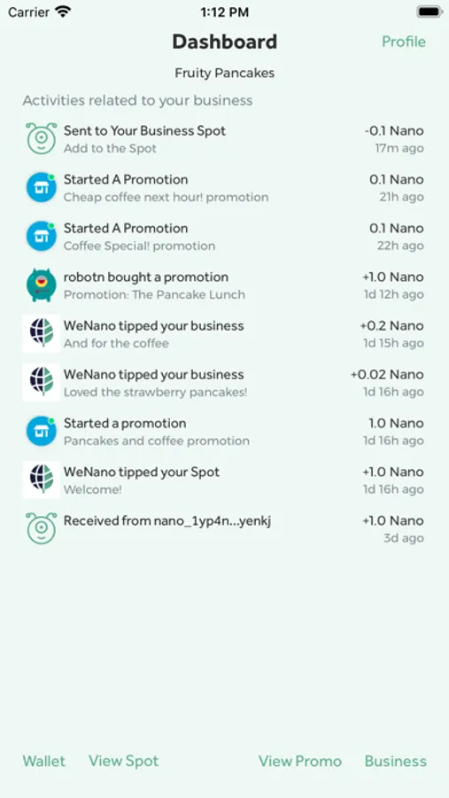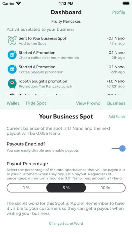 Business Spot - Spots is one of the most unique features of the main WeNano app, allowing users to set up and get payouts from Spots all over the world. With WeNano Business every business gets its own spot where your customers can get payouts by visiting your business. When you have the customer inside your business the chance of them buying something is a lot bigger.