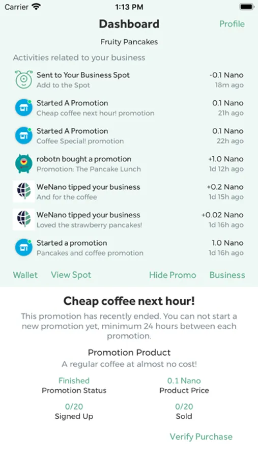 Promotions - Your business can simply set up promotions where you sell one product for a limited quantify and duration for a set Nano price. We will notify WeNano users close to your location as soon as your promotion is set up. A fun and unique way to draw attention to your business
