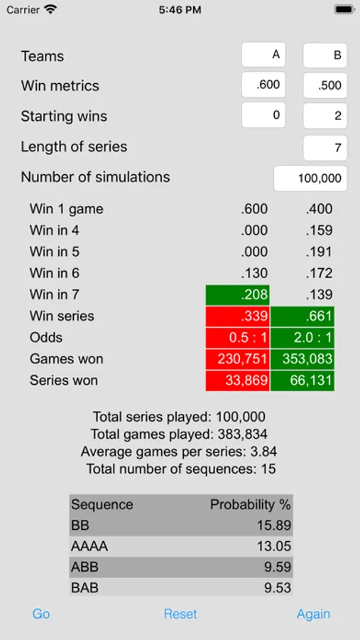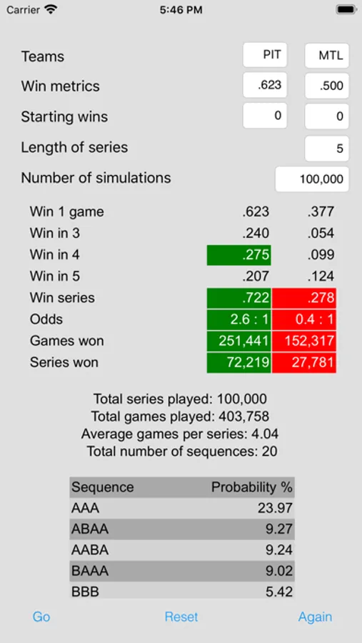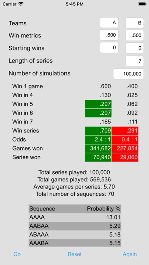 Playoff Simulator uses Monte Carlo techniques to simulate a playoff series ranging in length from 1-15 games. Playoff Simulator computes the probabilities and odds of different series outcomes (win in 4, win in 5, etc.) as well as the probabilities of different sequences of outcomes. You can also set the series starting point wins for each team!
