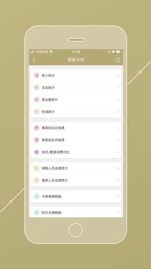 收入统计,利润统计,支出统计,日报月报,绩效提成,消费排行,充值排行,余额排行,积分排行,余次排行,销量排行,库存排行...
