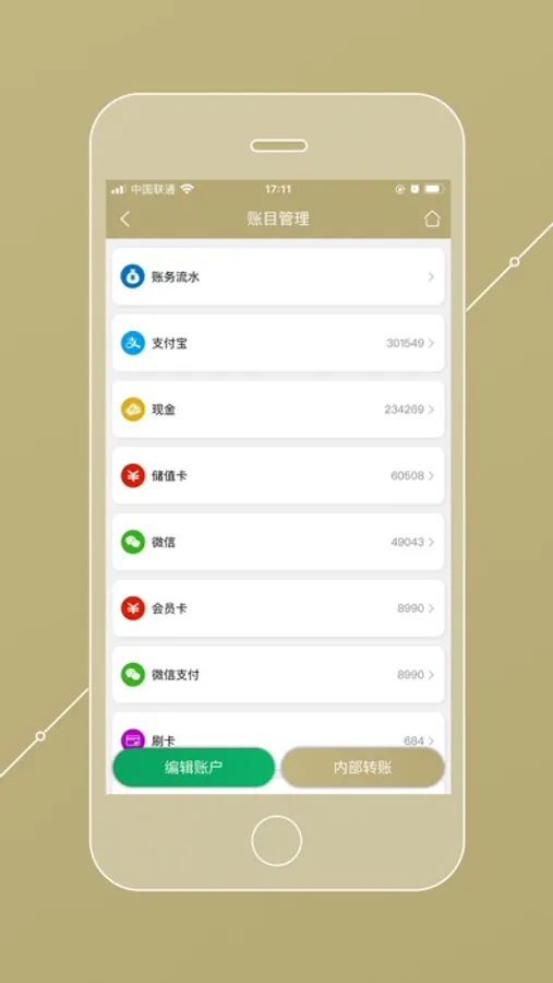 账务明细,分类明细,支付管理,内部转账...