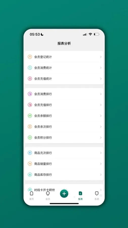 收入统计,利润统计,支出统计,日报月报,绩效提成,消费排行,充值排行,余额排行,积分排行,余次排行,销量排行,库存排行...