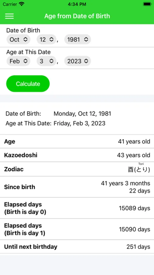 You can also check the age, counting year, zodiac, the number of days since birth, and the number of days until the next birthday.