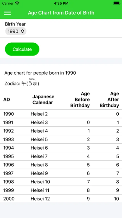 Age before and after birthday is also displayed in both Gregorian and Japanese calendars.