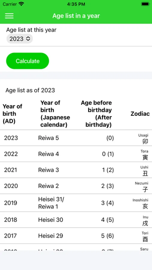 If you select a base year, you can see a list of your age and zodiac as of that base year for each year you were born.