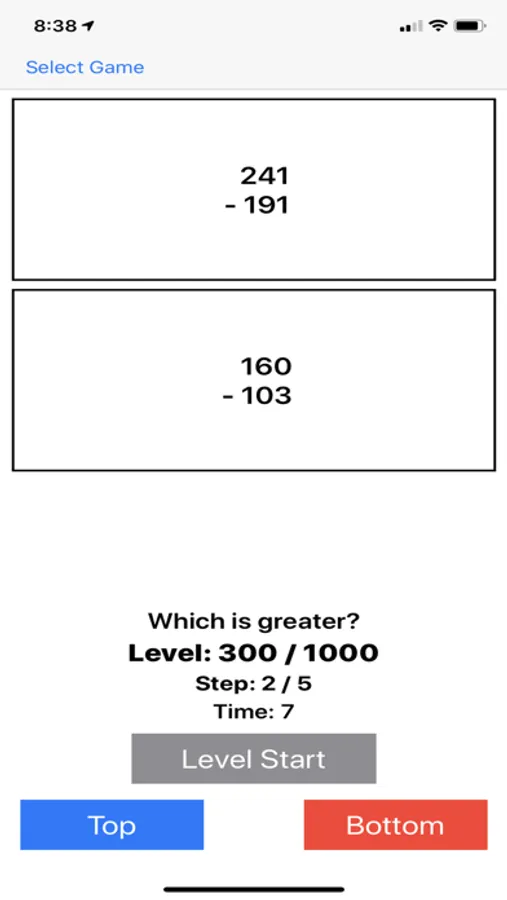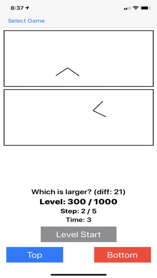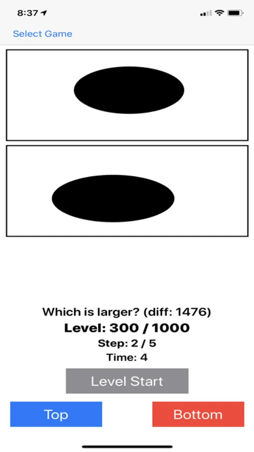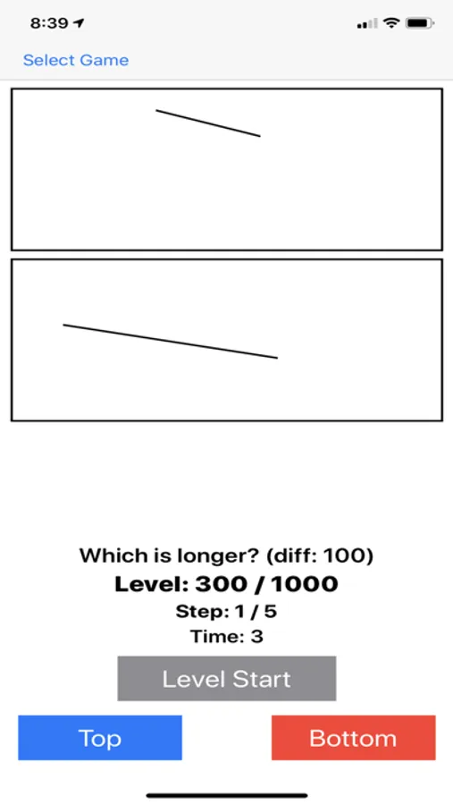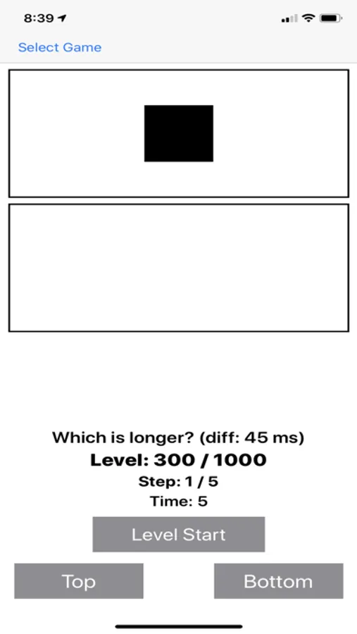 8. Time: Which is longer? Object 1 will appear for a certain amount of time in the top window, then Object 2 will appear for a different amount of time in the bottom window. Select the one appearing for a longer time. Improve your sixth sense for measuring time.