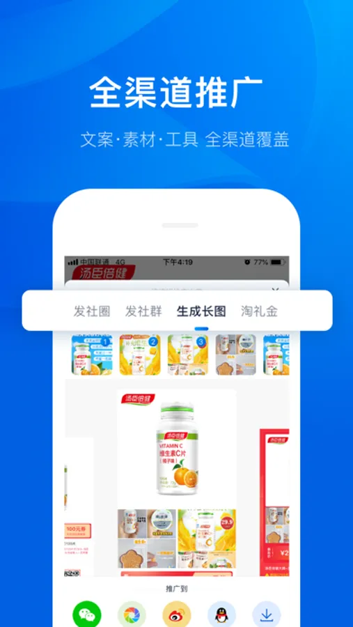 长图推广:多种推广模板,图片自由组合,一键生成精美推广图片,快速发送到各个推广渠道