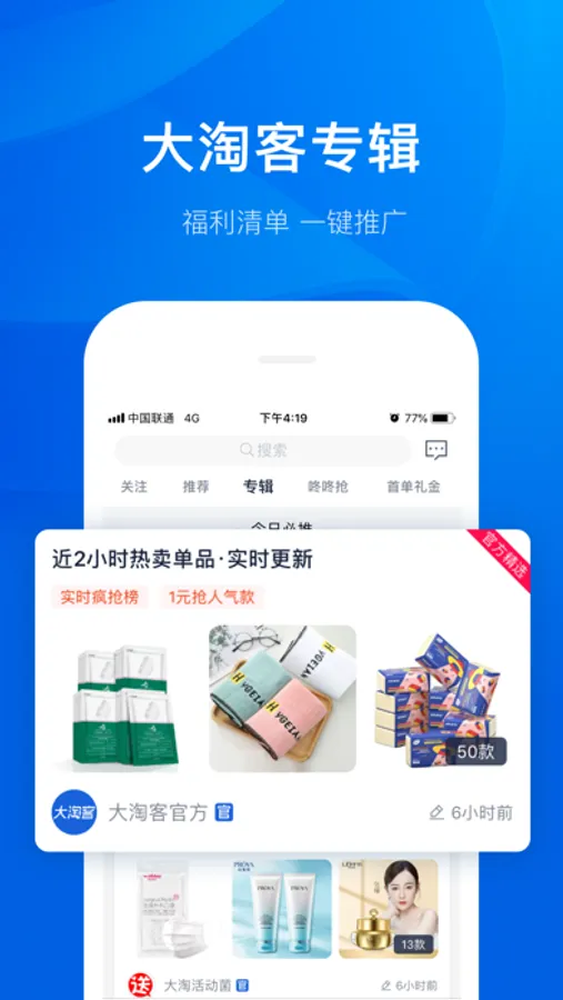 不管您是专业淘客,还是刚入门的小白,或者是在校学生、上班族、宝妈、美妆博主等,想要开展副业或者兼职,大淘客联盟APP都是您最好的选择!