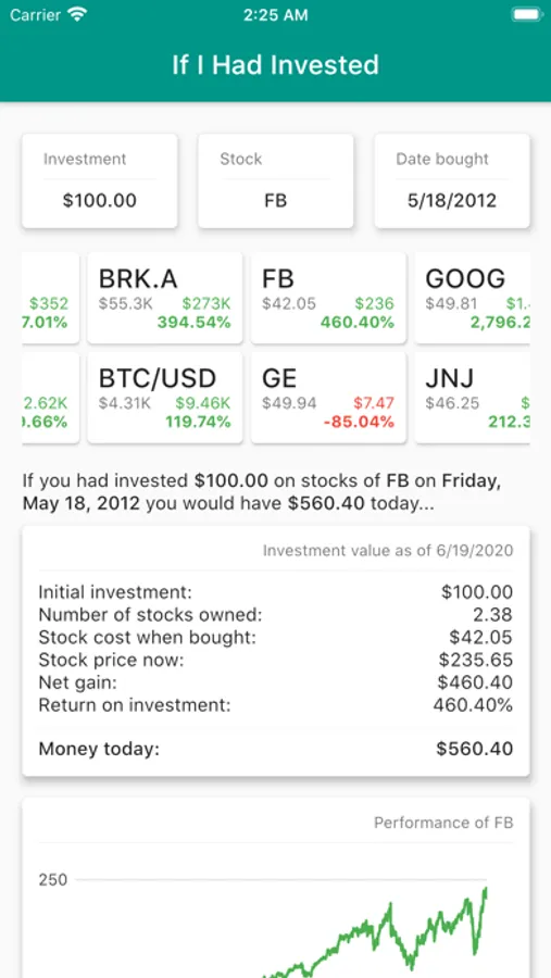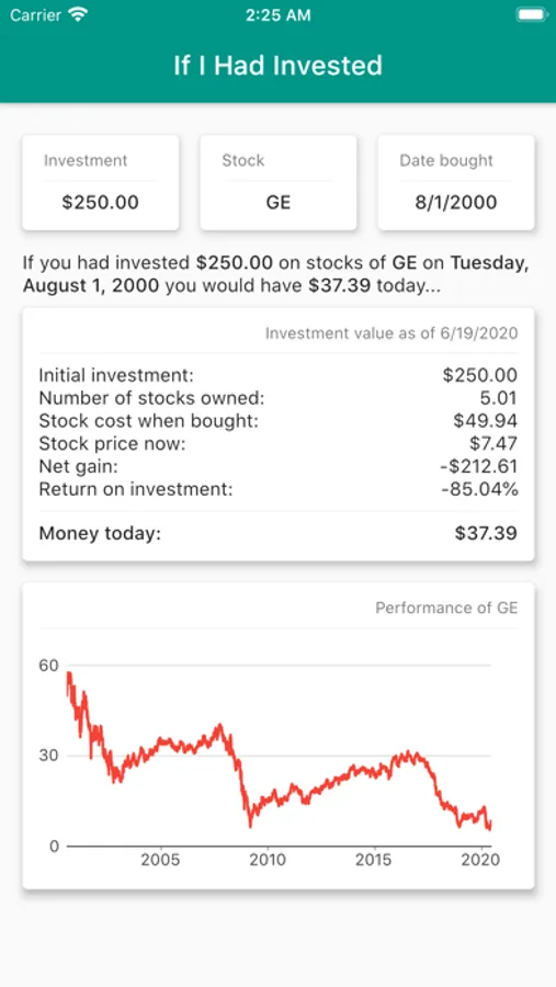 It also shows a small graphic at the bottom card with the performance the stock has had over the years, allowing you to change the date you'd like to enter as your initial investment date.