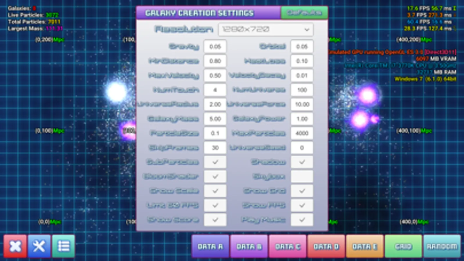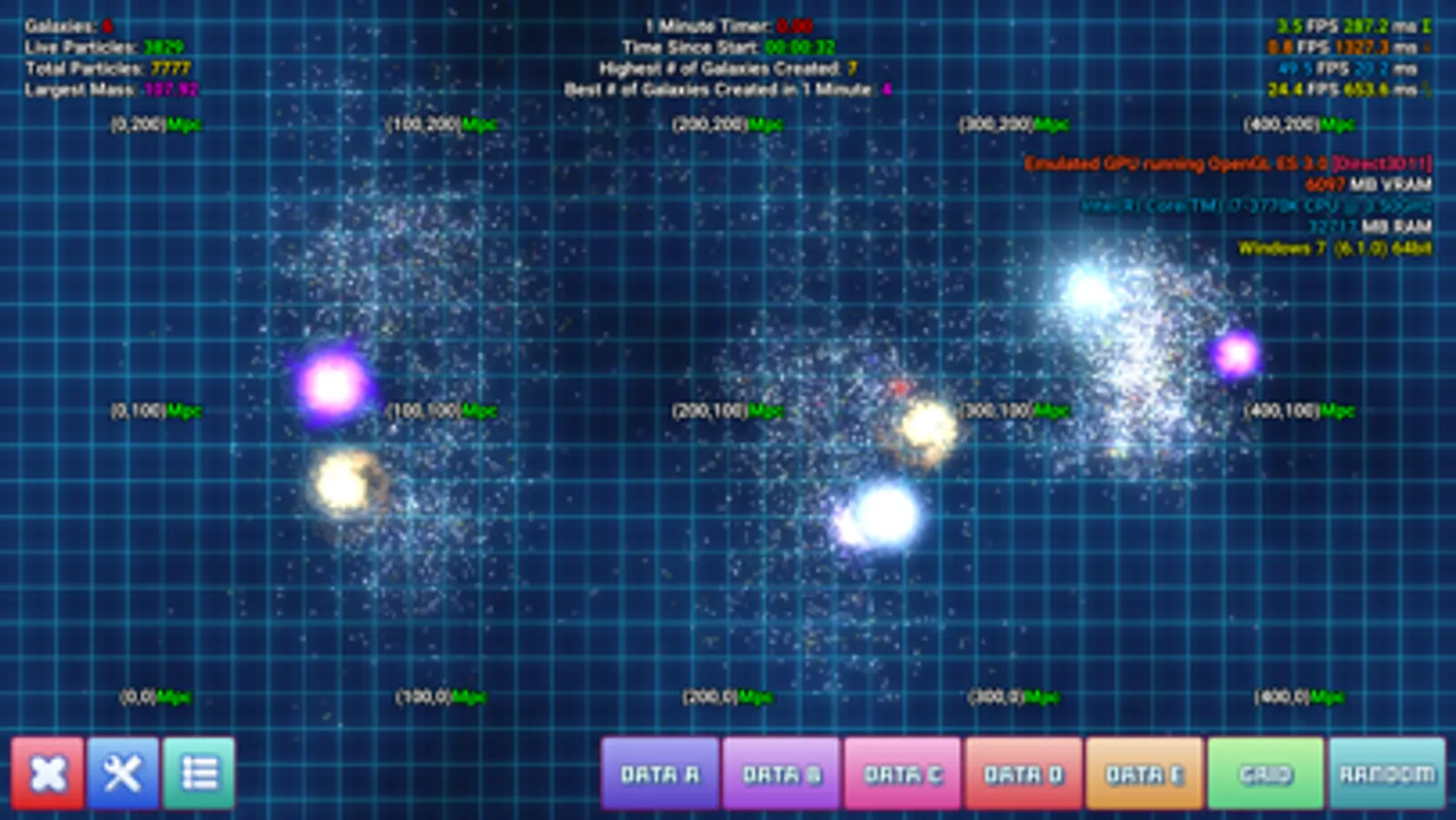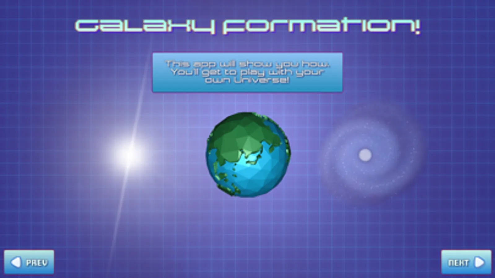 Galaxy Formation is a multi-platform educational app depicting how dark matter particles in the universe clump together over billions of years to form things like stars, planets and galaxies. The app does this with a lite, real-time simulation of thousands of n-body particles that are attracted by gravitational forces that form galaxies when combined.